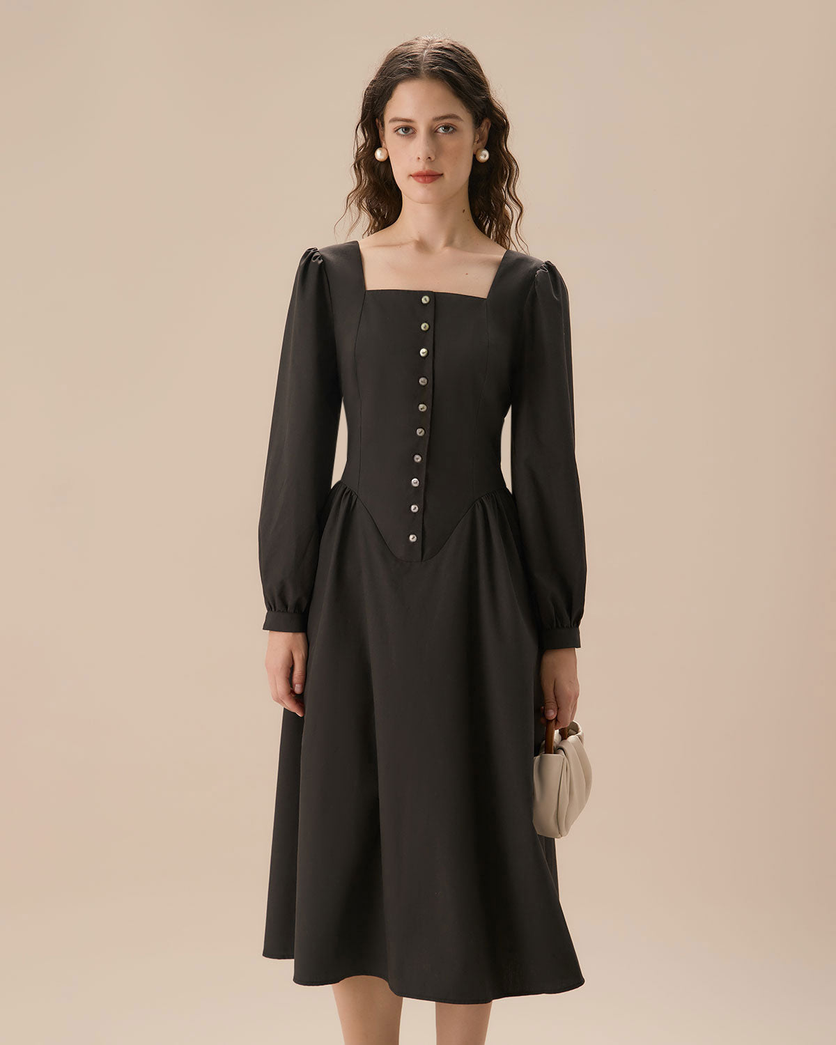 Fabric:This Puffed Sleeve Midi Dress is made of Viscose and Polyester. Viscose (aka rayon) is a man-made cellulosic fiber made from wood pulp. It’s soft, breathable, durable, and moisture-wicking. Polyester is an artificial fiber that feels soft, looks lustrous, and dries fast. Description:The square neckline offers a flattering, structured look, while the puffed sleeves add a touch of drama and sophistication. Designed in a classic black, this midi-length dress is perfect for both day and evening events. Its tailored fit accentuates your figure without being too tight, offering comfort and style. Details:- Occasion: special occasion- Fabric Stretch: No Stretch- Sleeve Type: Puffed Sleeve- Neckline: Square Neck- Silhouette: A-Line- Fabric: Polyester 70.0%, Viscose 30.0%