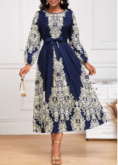 ROTITA Tie Tribal Print Navy Belted Round Neck Dress