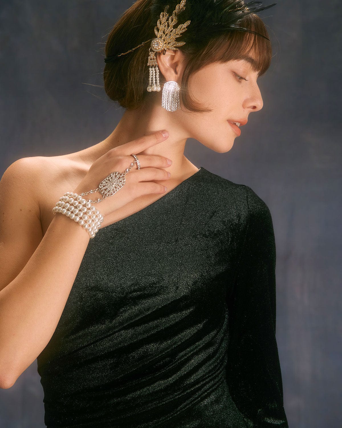 Details:- Formal- One Shoulder- Ruched- Lurex- Slim Fit- Slight Stretch- 95% Polyester, 5% SpandexFabric:This Velvet Mini Dress is made of Polyester and Spandex. Polyester is an artificial fiber that feels soft, looks lustrous, and dries fast. It’s also d