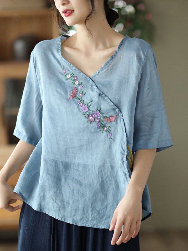 SkuCY-!104790MaterialRamie Cotton StyleLoose , Half Sleeves FeatureContrast Color , Embroidered NecklineV-neck OccasionVintage , Artistic Retro , Original Creation SeasonsSpring , Summer TypeT-Shirts Tops ColorBLUE,YELLOW,APRICOTSizeOne_size Please consult the size chart we provide for this item’s measurements to help you decide which size to buy.Please note: There may be 1-3cm differ due to manual measur