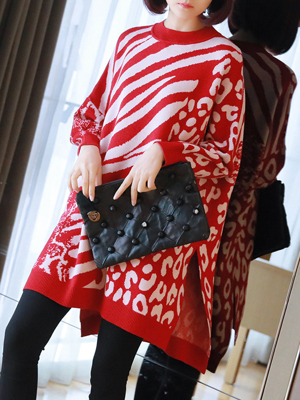 Vintage Loose Zebra-Stripe Split-Side Leopard Sweater Tops Pullovers RED-One_size