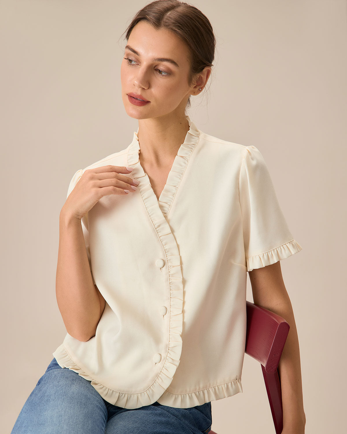 Fabric:This Ruffle Blouse is made of Viscose and Spandex. Viscose (aka rayon) is a man-made cellulosic fiber made from wood pulp. It’s soft, breathable, durable, and moisture-wicking. Spandex is lightweight and comfortable to wear, resistant to sweat, has excellent elasticity, and is durable and robust. Description:Featuring a flattering V-neckline and delicate ruffle details, this blouse adds a touch of sophistication to any outfit. The soft beige color offers versatility, making it easy to pair with various bottoms for different occasions. Made from lightweight, breathable fabric, it ensures comfort throughout the day. Details:- Occasion: Daily- Fabric Stretch: No Stretch- Embellishment: Ruffle, Button- Neckline: V Neck- Collar: Ruffle- Fabric: Polyester 92.0%, Spandex 8.0%